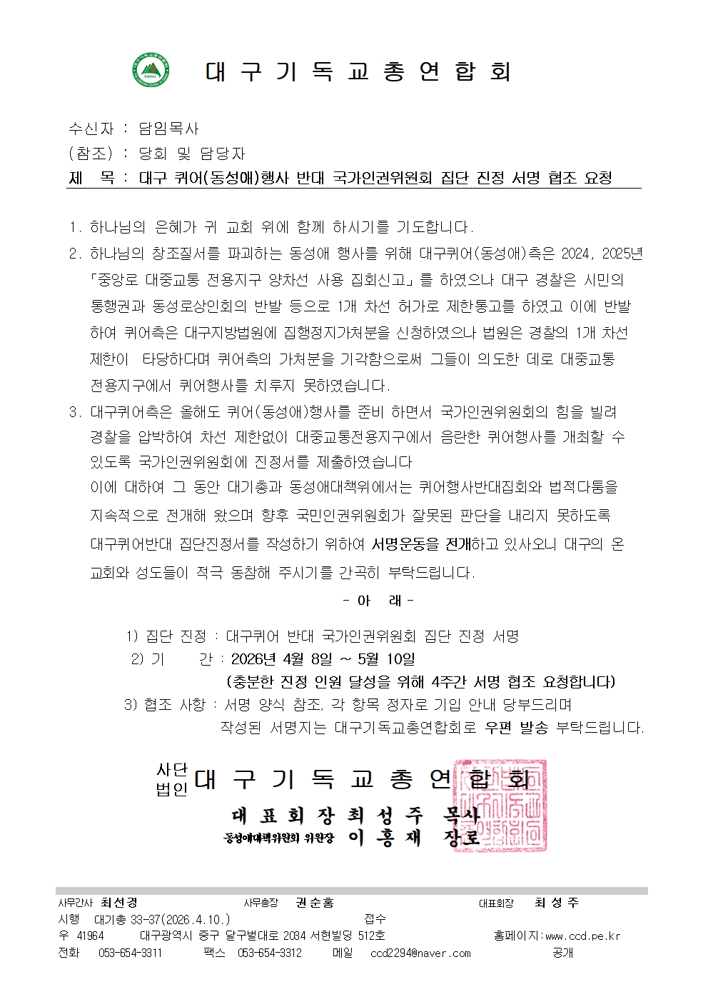ÀÛ¼ºµÈ ¼­¸íÁö´Â ´ë±¸±âµ¶±³ÃÑ¿¬ÇÕȸ·Î ¿ìÆí ¹ß¼Û ºÎʵ右´Ï´Ù
